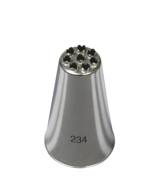 Закрытая конусовидная насадка с небольшими отверстиями на конце. С помощью Травки кондитеры создают рельеф для тортов и пирожных, визуально напоминающий луг с настоящей травой. Также этот тип насадки можно использовать при необходимости сымитировать шерсть животного.
